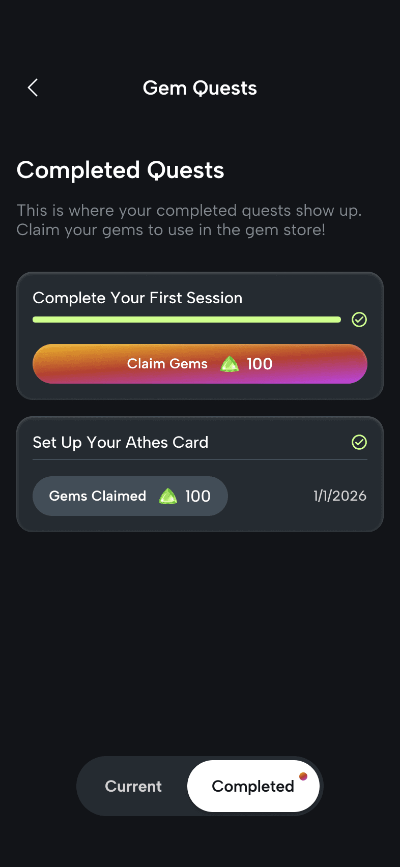 Your AthesCard shows your player archetype and skill ratings. The more sessions you complete, the faster your rating improves.